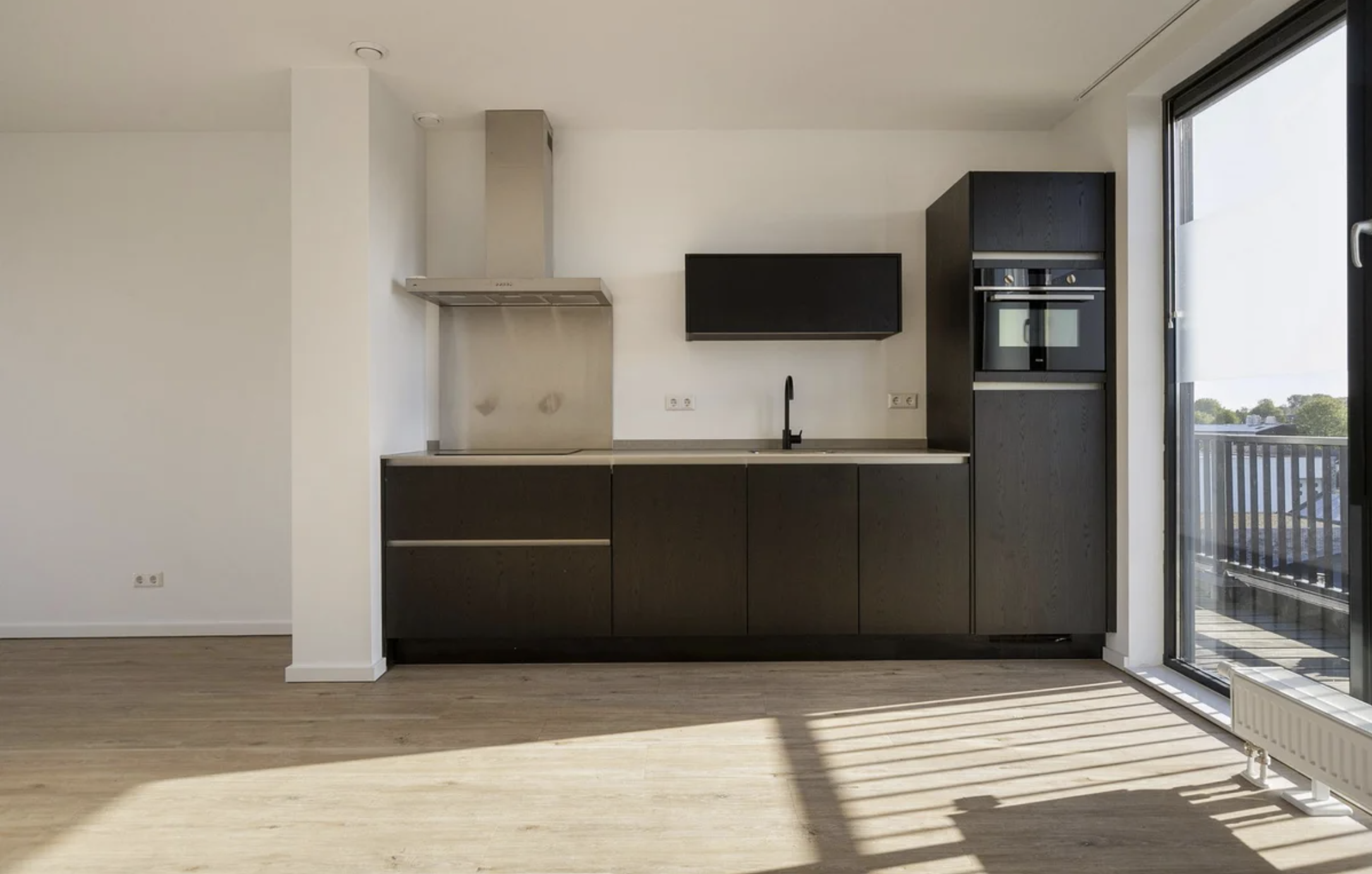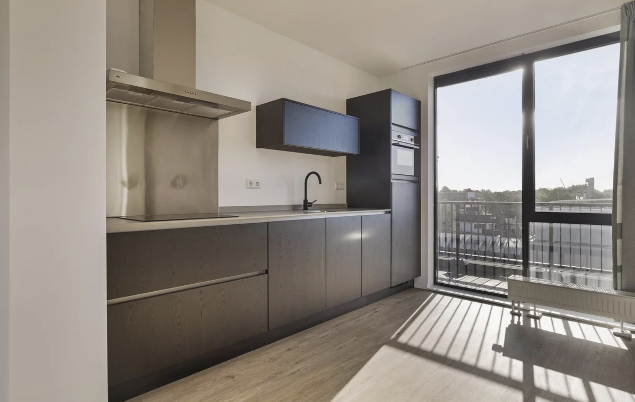 - Open keuken met inbouwapparatuur (koelkast met vriesvak, combimagnetron/-oven, inductie kookplaat, afzuigkap);