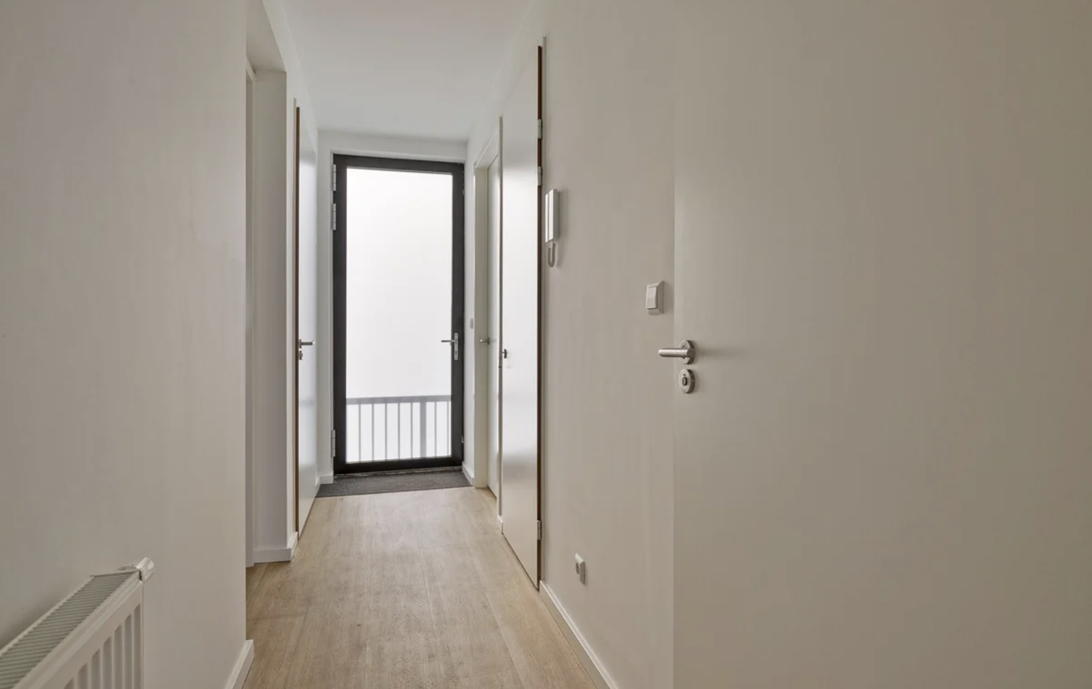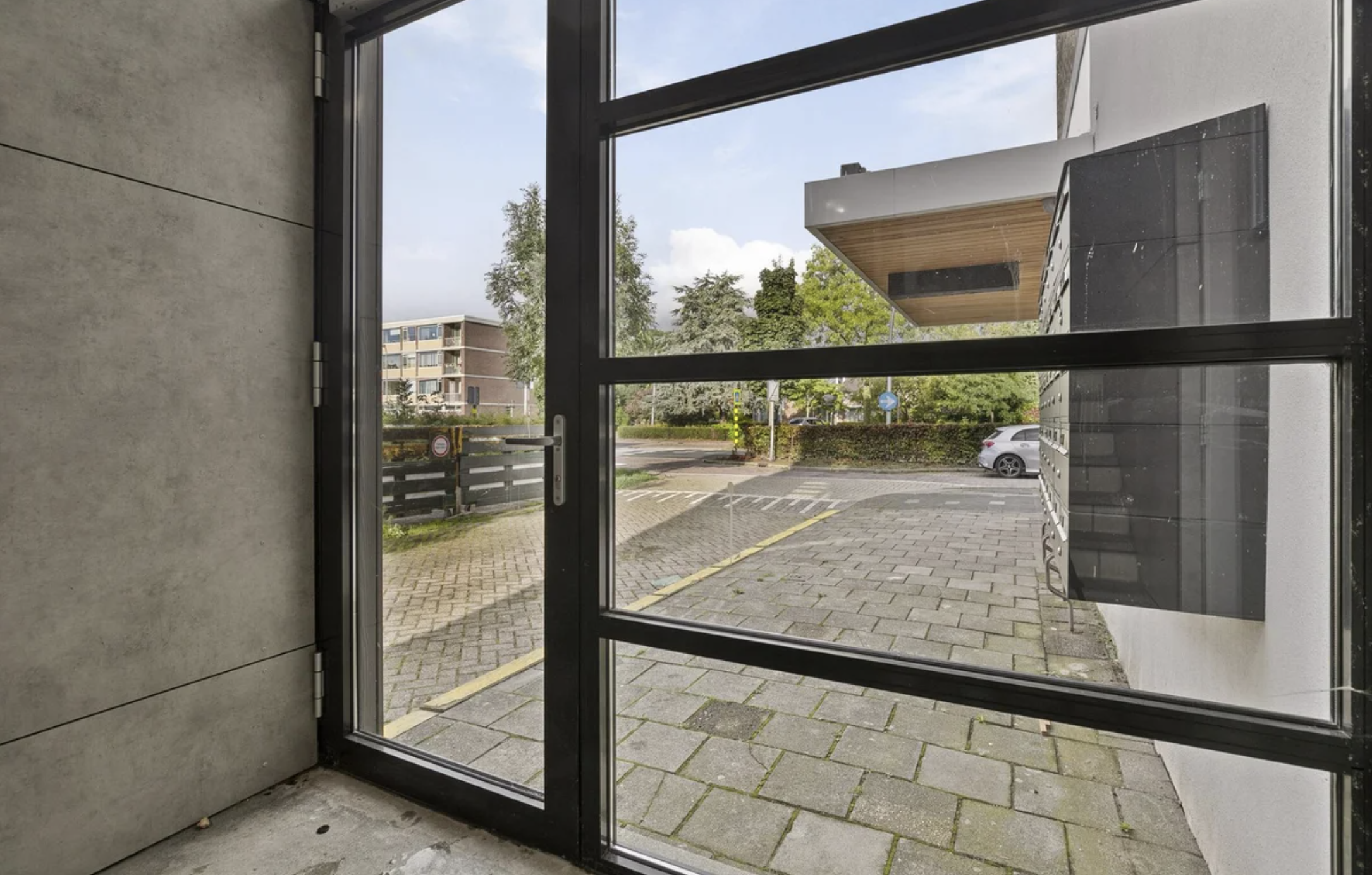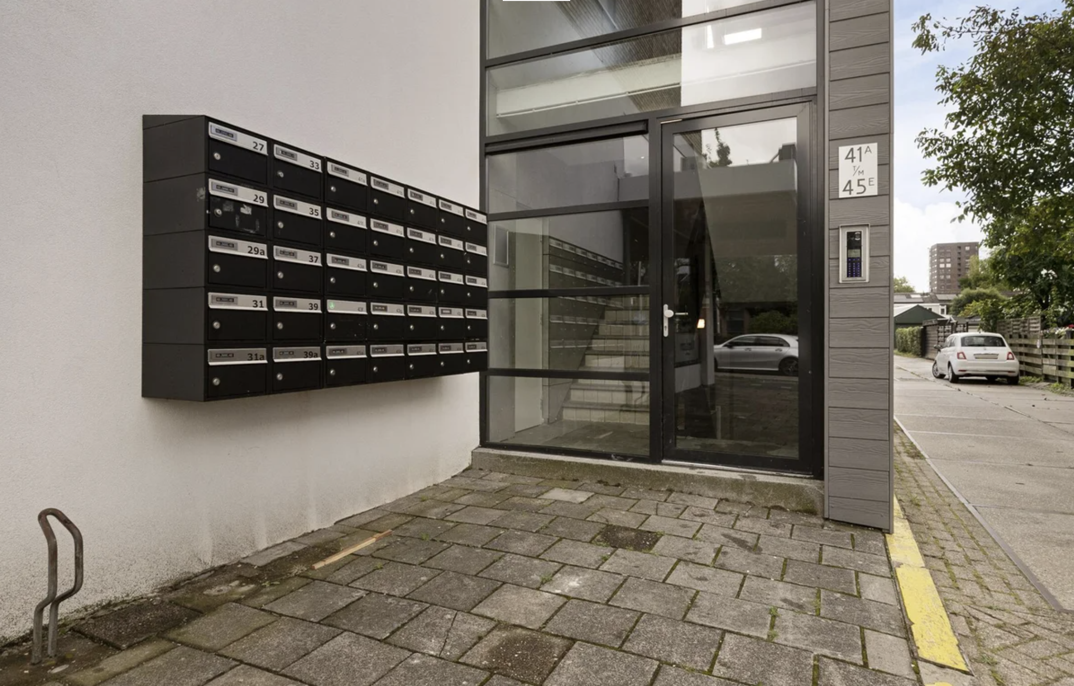 Centrale entree met aan de buitenzijde een intercom en brievenbussen.