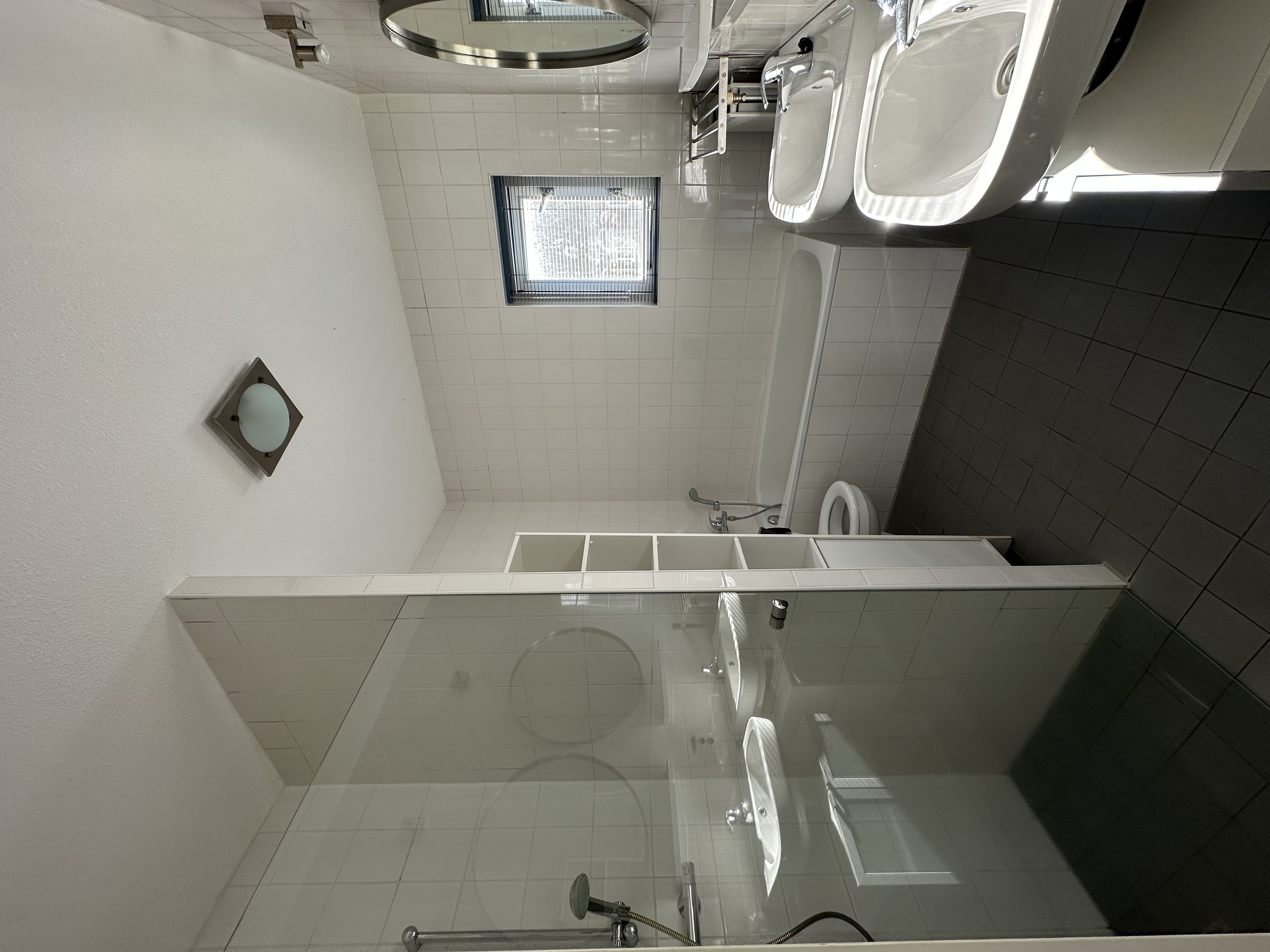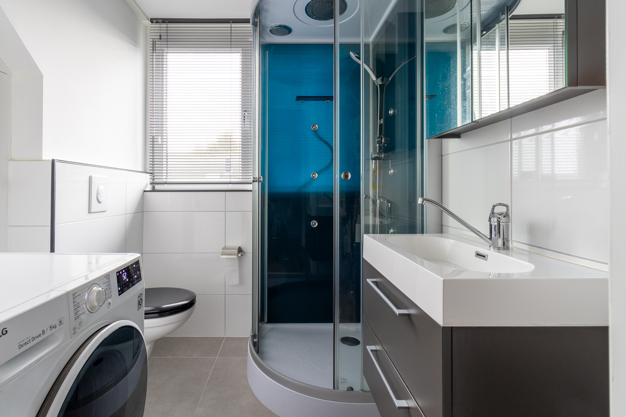 - De complete en geheel betegelde badkamer is voorzien van een douche, zwevend closet, wasmachine en toilet.