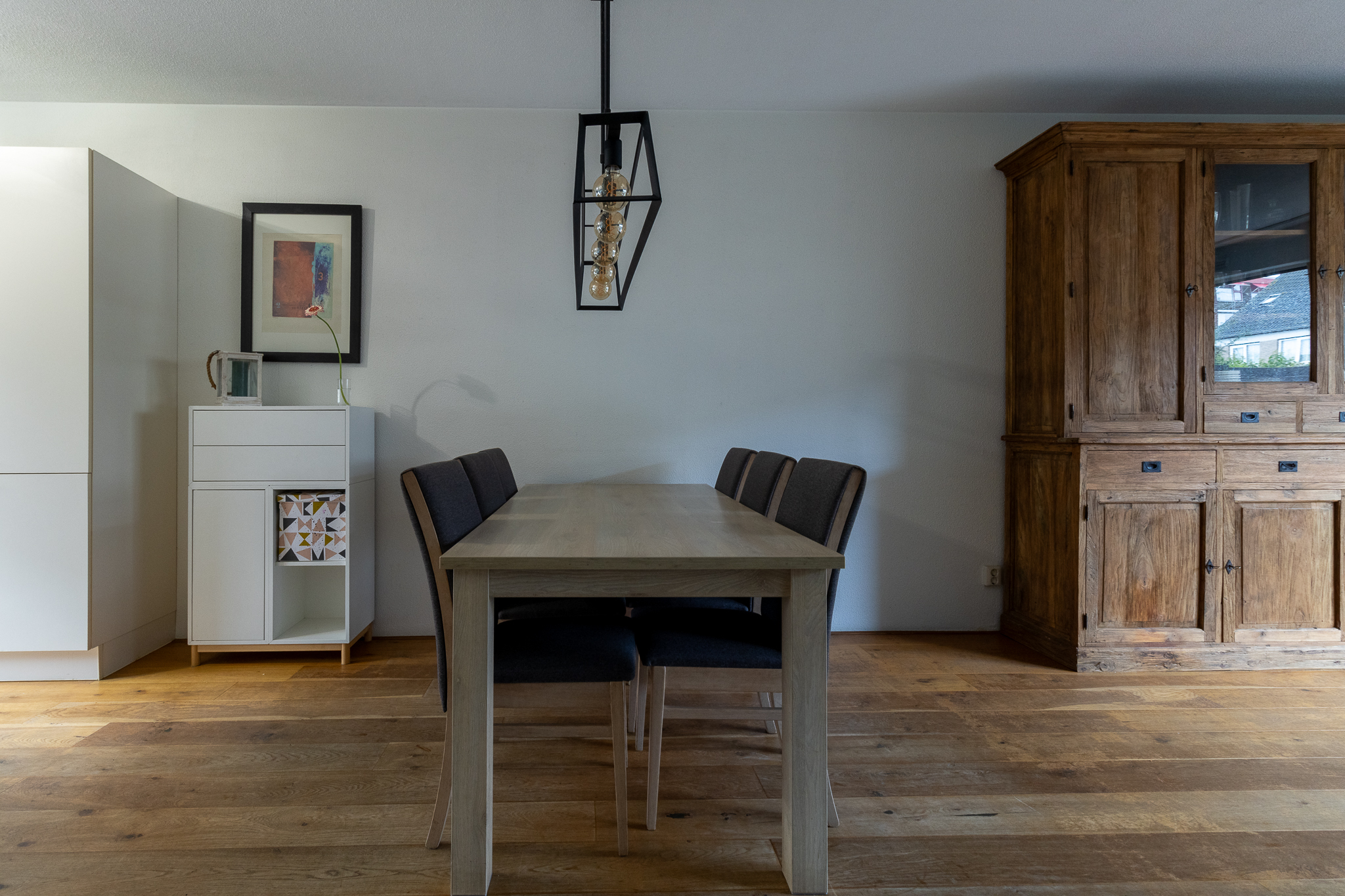 - Deze woonkeuken is voorzien van een keurig keukenblok in rechte opstelling met een koelkast, vaatwasser, gaskookplaat, afzuigkap, magnetron en een oven.