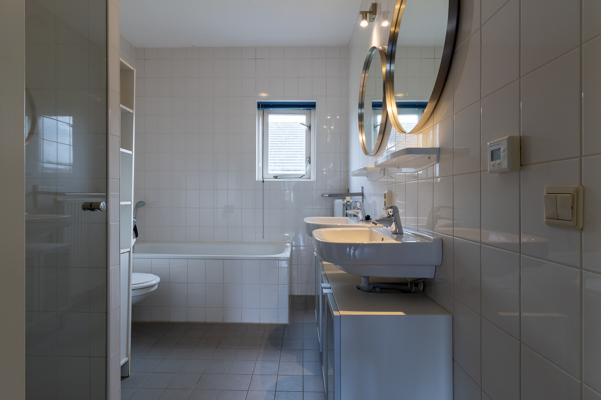 - De complete en geheel betegelde badkamer is voorzien van een ligbad, inloopdouche, zwevend closet en een dubbele wastafel.