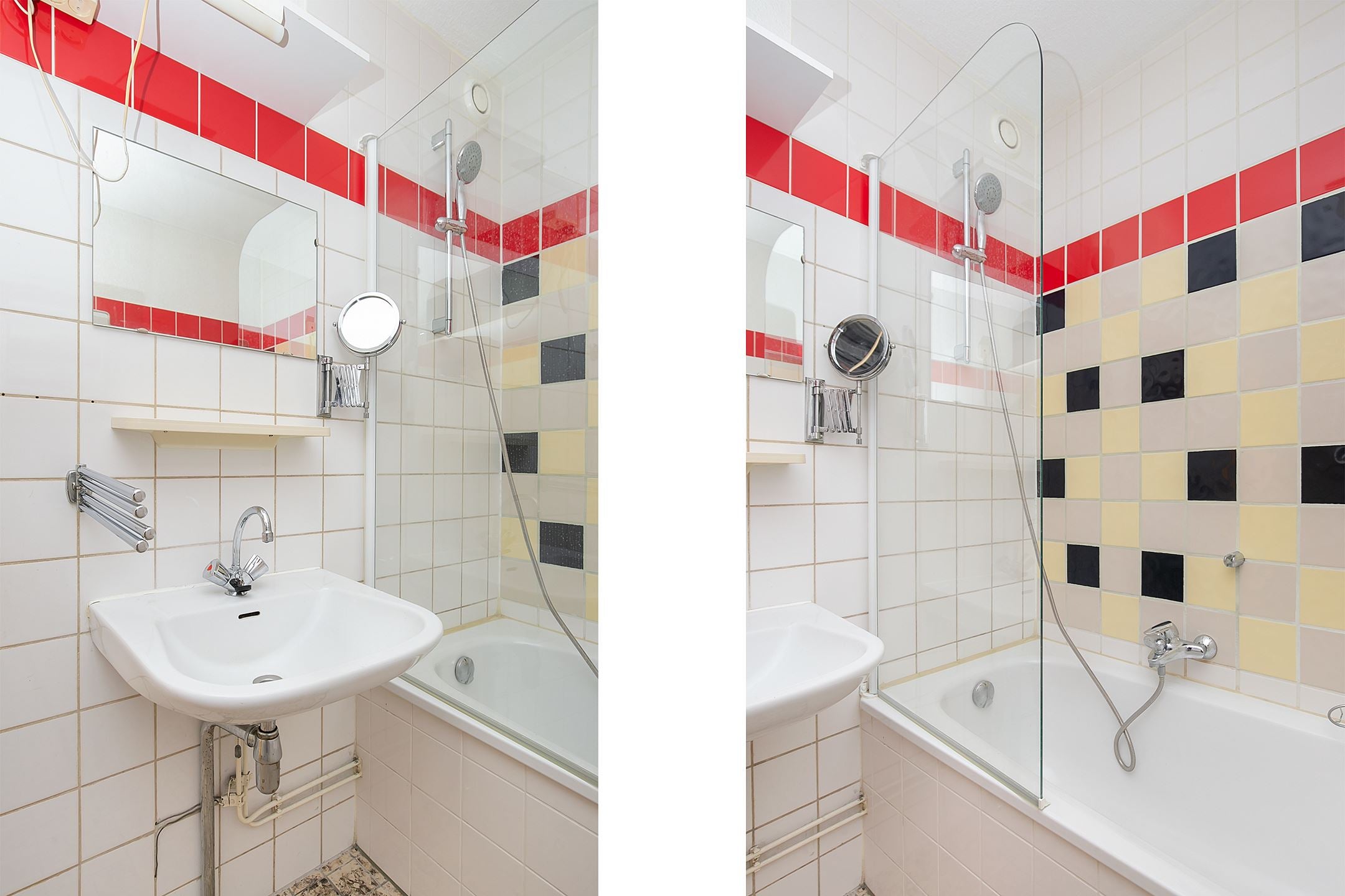 - Badkamer met wastafel, ligbad-/douche combinatie en wasmachineaansluiting.