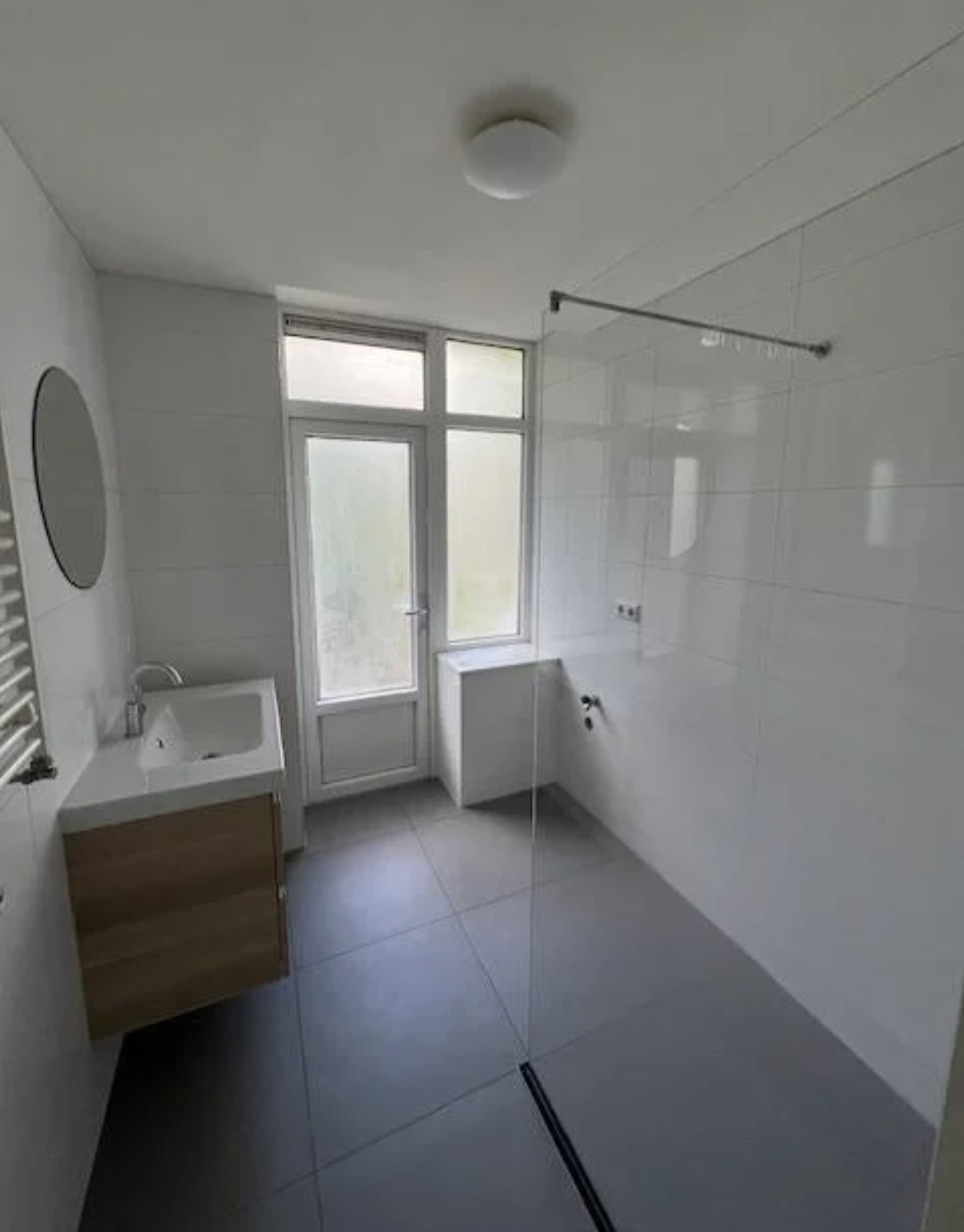 - De volledig betegelde badkamer is voorzien van een inloopdouche en een wastafel met meubel.