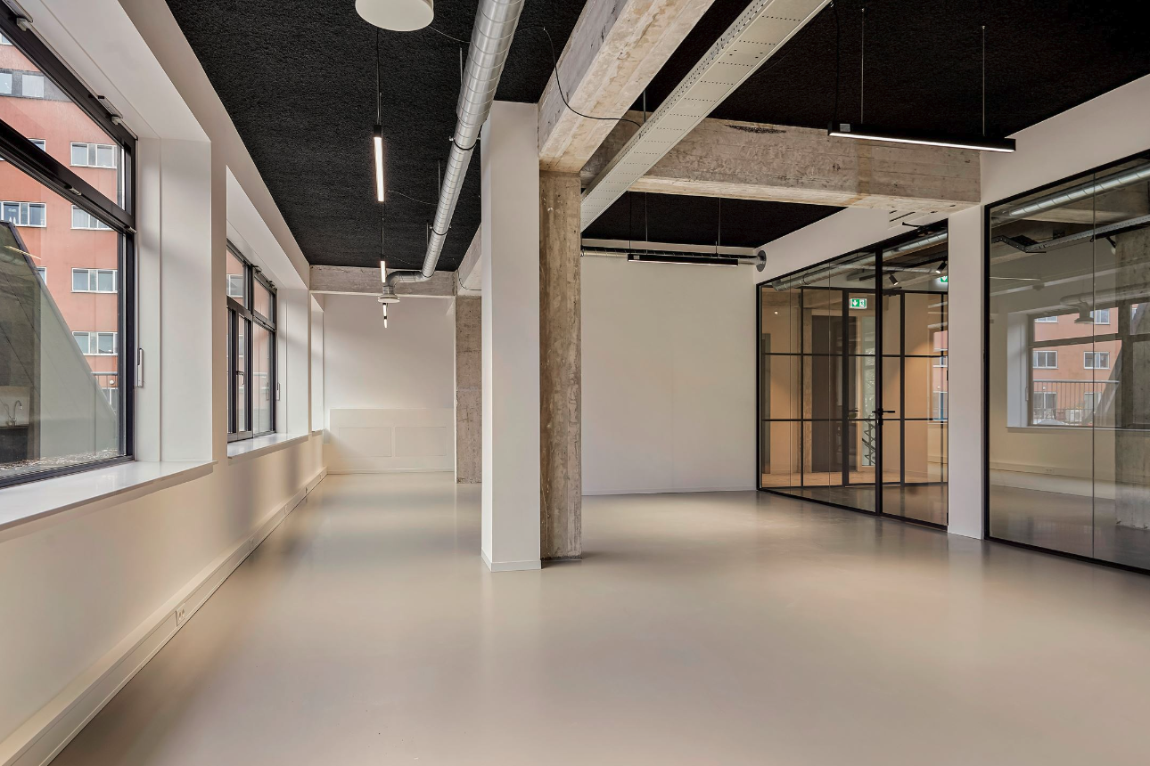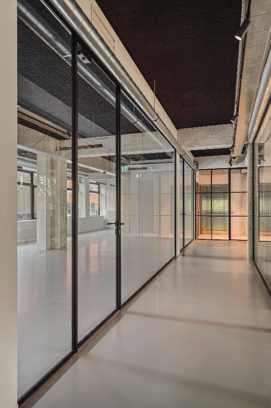 - Een industrieel plafond (akoestisch afgewerkt) inclusief vrij hangende LED verlichtingsarmaturen);